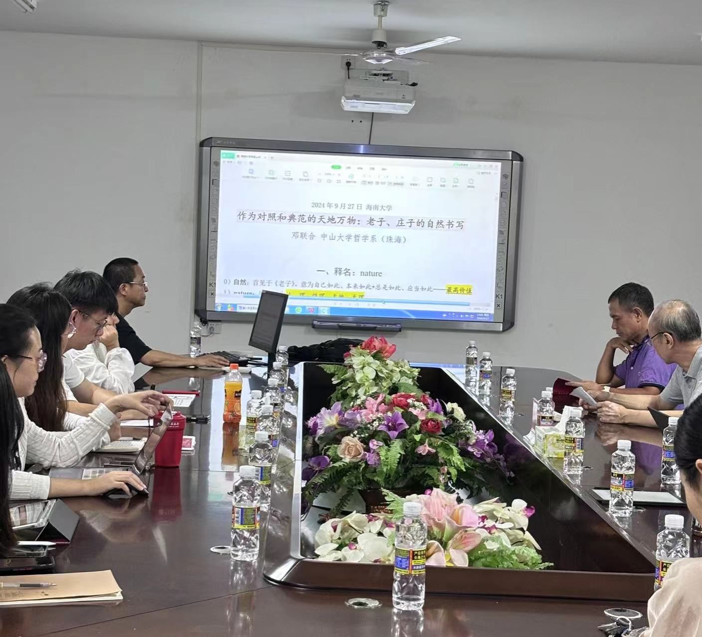 2024年9月27日晚19:00,澳门正规电子游戏平台邀请中山大学哲学系(珠海)邓联合教授在社科楼A311会议室为学院师生作“作为对照和典范的天地万物——老子、庄子的自然书写”专题讲座。讲座由澳门正规电子游戏平台黄启祥教授主持,学院部分教师、本硕博学生参加了本次讲座。