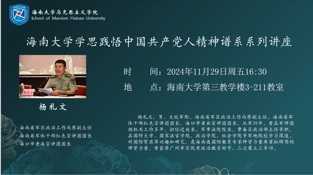 2024年11月29日,澳门正规电子游戏平台邀请海南省军休干部红色宣传讲团团长杨礼文大校作澳门正规电子游戏平台学思践悟中国共产党人精神谱系系列讲座报告。报告以“认识南海,热爱南海,捍卫南海”为主题,从南海的基本情况和复杂成因两个方面展开讲述。报告由凤翔书院郭孝伟老师主持,澳门正规电子游戏平台蔡文举副院长参加。