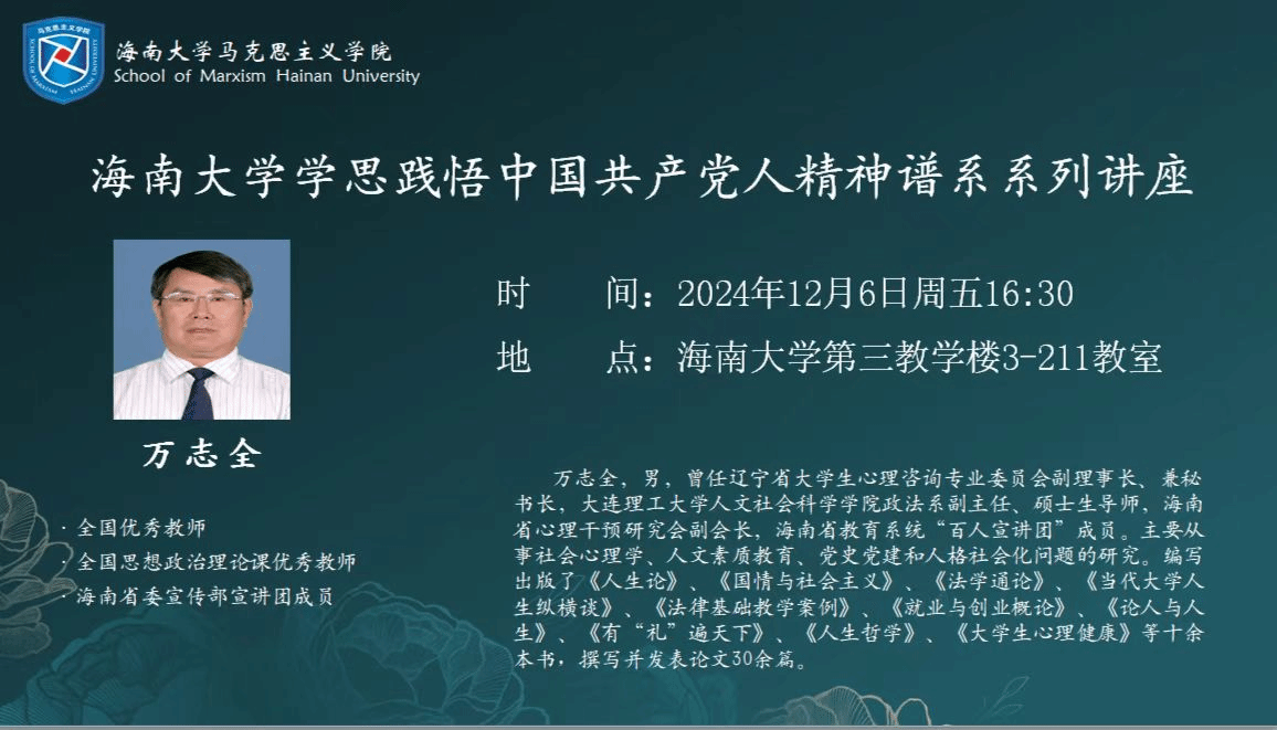 2024年12月6日,澳门正规电子游戏平台邀请全国思想政治理论课优秀教师万志全作澳门正规电子游戏平台学思践悟中国共产党人精神谱系系列讲座报告。报告以“新时代教育家精神进校园”为主题,从教育家精神和人格社会化两个方面展开讲述。澳门正规电子游戏平台蔡文举副院长参加。