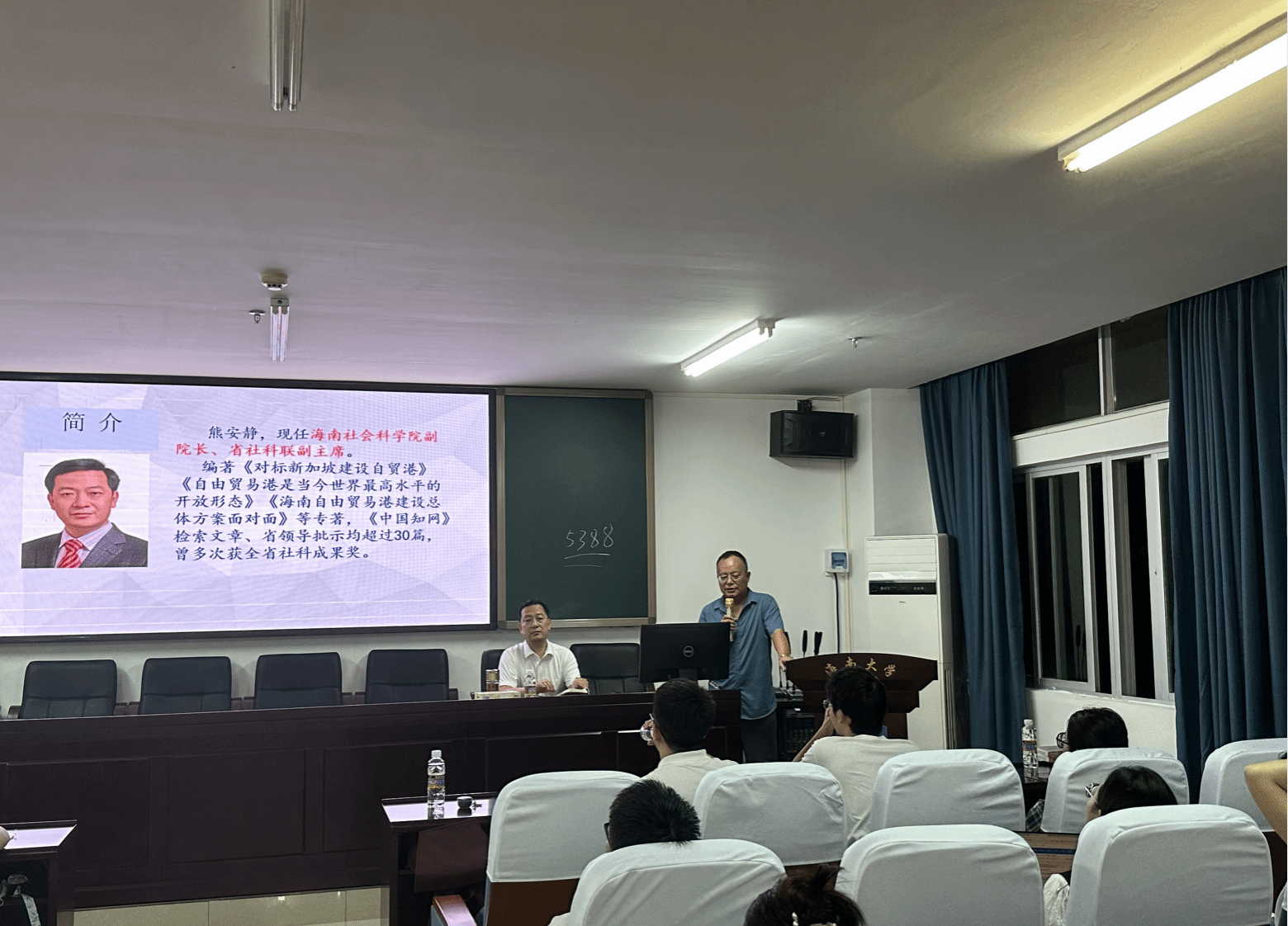2023年10月23日,澳门正规电子游戏平台“冬季小学期系列课程”第五讲在社科楼A309会议室举⾏。海南社科联副主席熊安静以“海南自由贸易港试点政策进展与封关运作展望”为题,为澳门正规电子游戏平台师生做了一场生动的报告。报告会由王善副院长主持,澳门正规电子游戏平台本科生、研究生以及博士生聆听了此次学术报告。