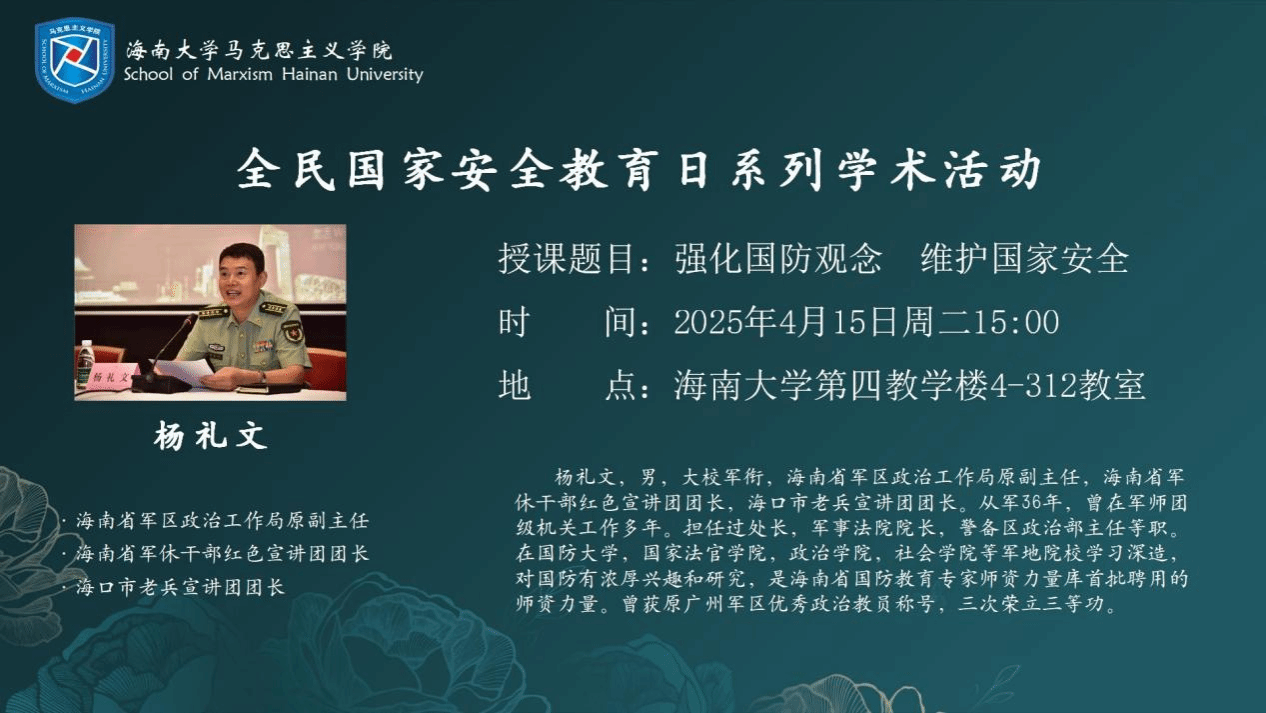 2025年是《中华人民共和国国家安全法》颁布施行10周年,为深入学习贯彻总体国家安全观,提升国家安全意识和素养。2025年4月15日下午,澳门正规电子游戏平台邀请海南省军休干部红色宣传讲团团长杨礼文走进形势与政策课堂,以“强化国防观念,维护国防安全”为主题,从树立国防观念的历史背景和当前国际局势两个方面展开授课。