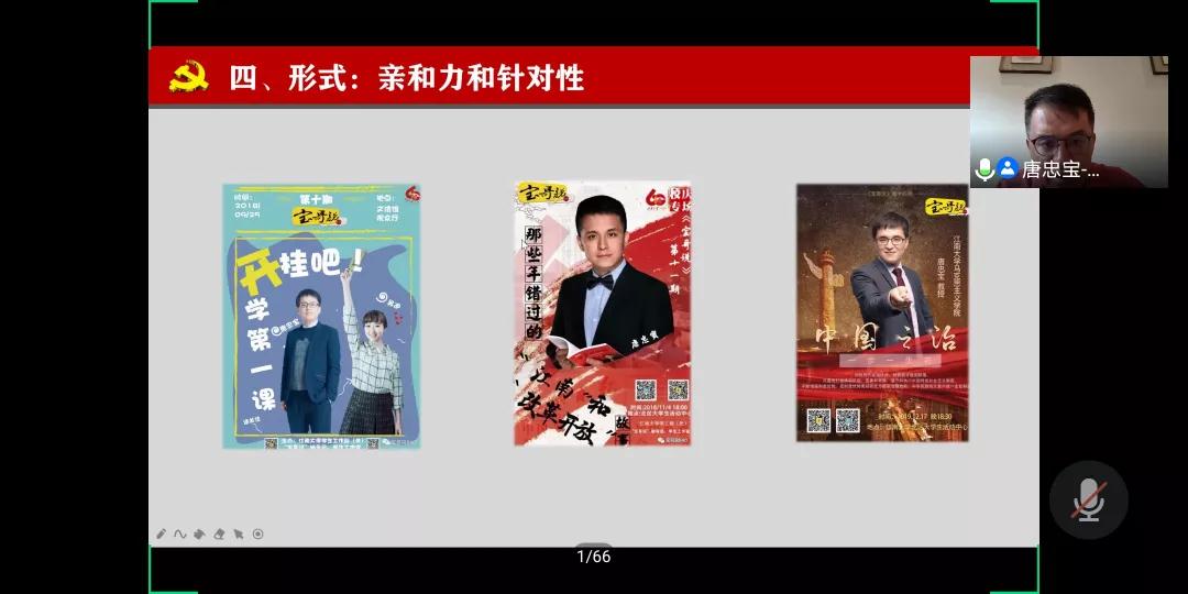 7月7日下午,中央电视台《百家讲坛》主讲嘉宾、中宣部全国“基层理论宣讲先进个人”、教育部全国“高校网络教育名师”、江南大学beat365正版唯一官网必一唐忠宝教授应内蒙古师范大学beat365正版唯一官网必一邀请,与全区思政课教师相聚云端集体备课,并作了“提升《形势与政策》课堂教学魅力的几点思考”的专题报告。本次线上集体备课会由内蒙古师范大学beat365正版唯一官网必一院长李春晖主持,全区各高校思政课教师200余人参会。