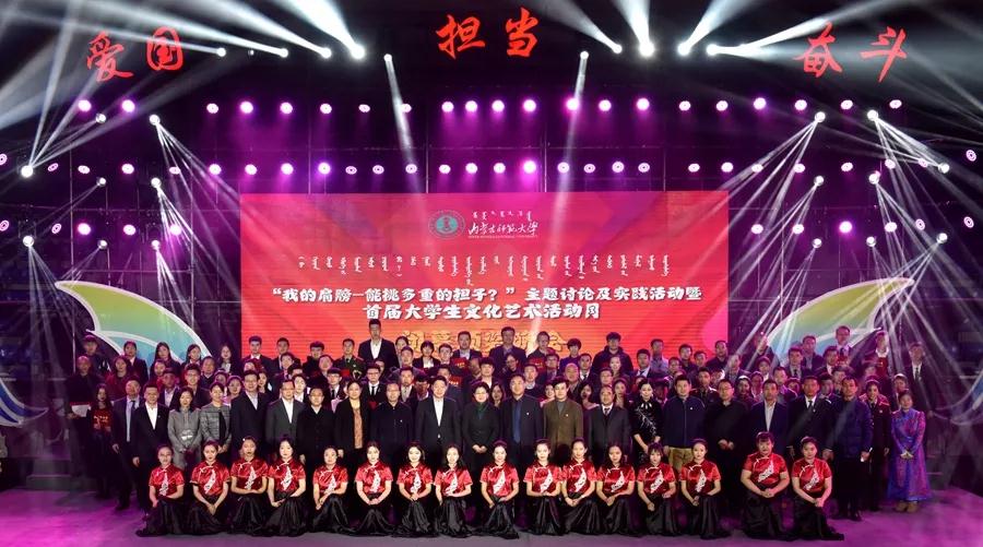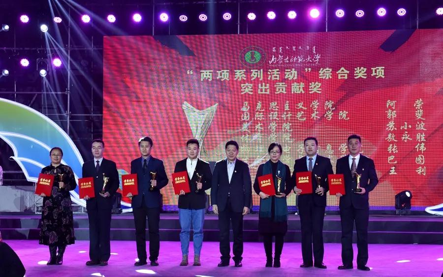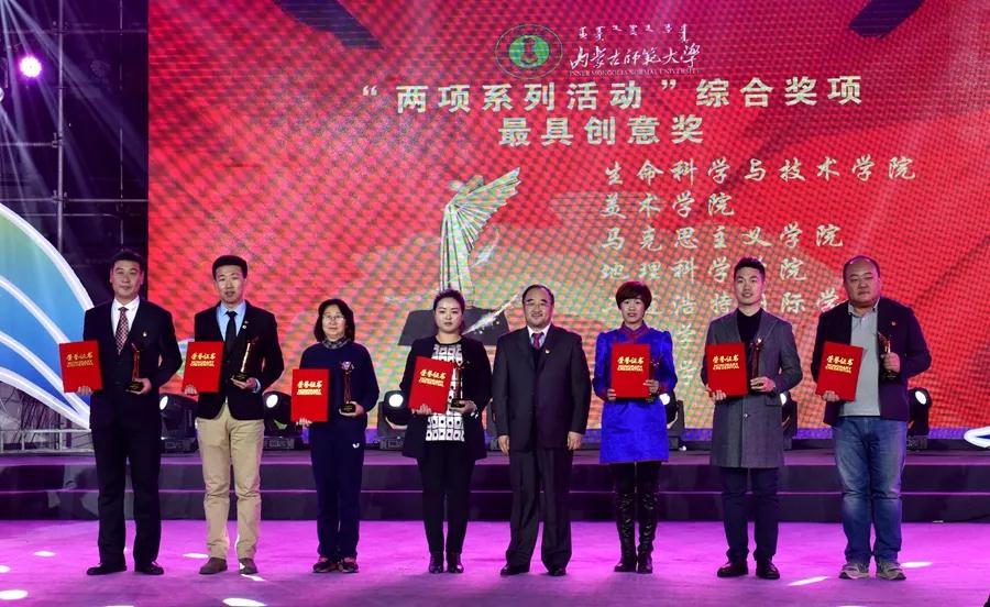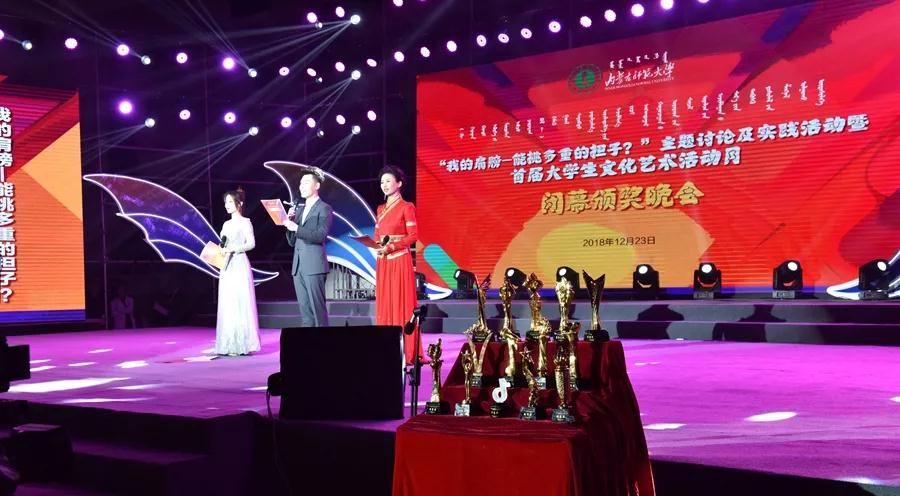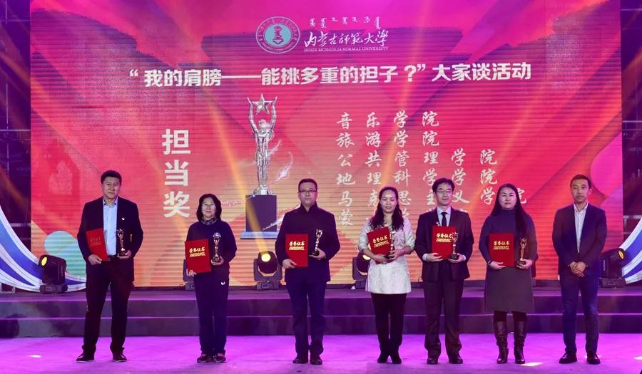12月23日晚,内蒙古师范大学“我的肩膀——能挑多重的担子?”主题讨论及实践活动暨首届大学生文化艺术活动月颁奖晚会在赛罕校区体育馆举行。校党委书记黄雅丽,党委副书记、纪委书记高云峰,副校长刘九万,党委委员、党委宣传部部长张宝成及相关部门负责同志出席活动并为获奖师生颁奖。beat365党总支书记贺瑞,副书记、副院长阿荣,团总支书记范晓刚以及付桂军教授参加了本次活动。