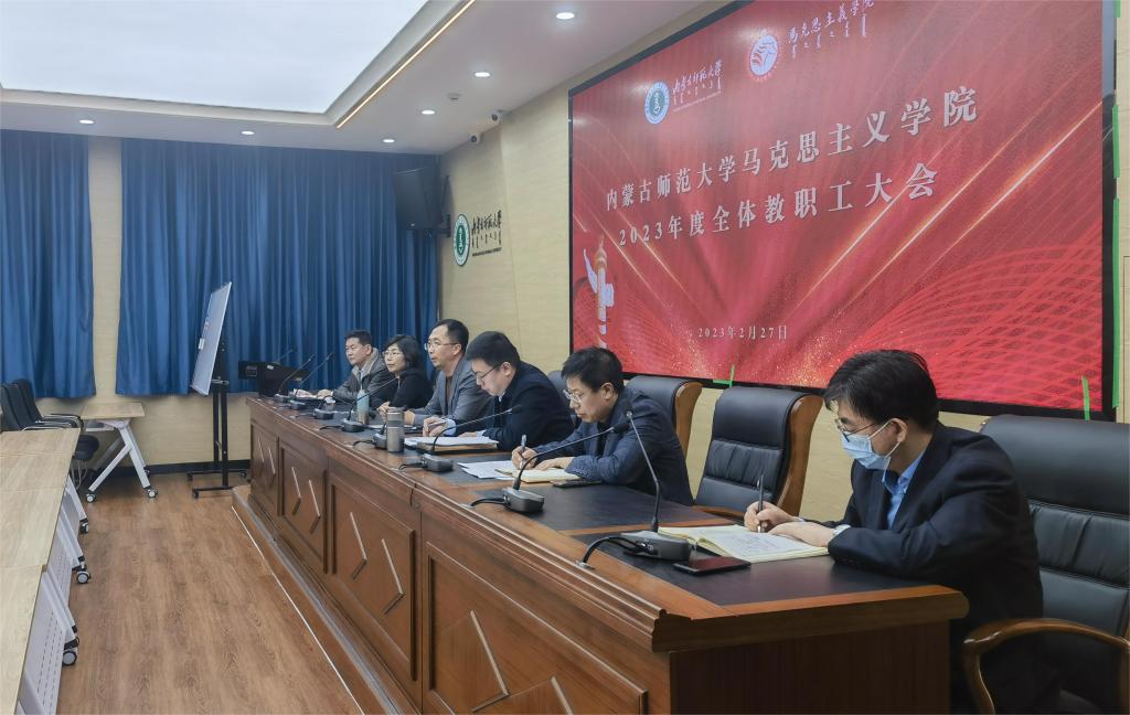 各分管工作领域副院长对2023年度工作作出具体要求。姚文帅介绍了毕业生就业创业安排情况,传达了《关于做好师范生免试认定改革有关研修工作的通知》文件精神;刘爱华分别从思想政治教育专业示范认证、2024本科教学审核评估、课程与教学团队建设、教学研究、高质量办好系列专项工作6个方面对本科教学工作提出了更新更高的要求。她强调要重点打造在线开放精品课程,继续推动校级精品课程,努力刷新学院的教学工作成绩;钢布和强调思政课教师要谨记思政课教师的岗位要求,深入研究教材内容,吃准吃透教材基本精神,认真讲好每一堂课;张瑞军要求老师们对待课题要提前谋划,认真撰写,反复打磨,特别是要有信心、有冲劲申报国家、教育部重大、重点项目课题。