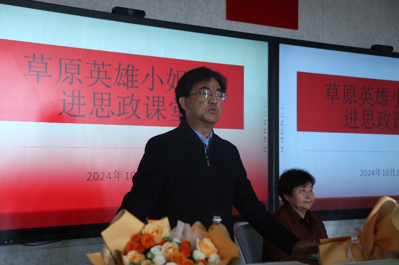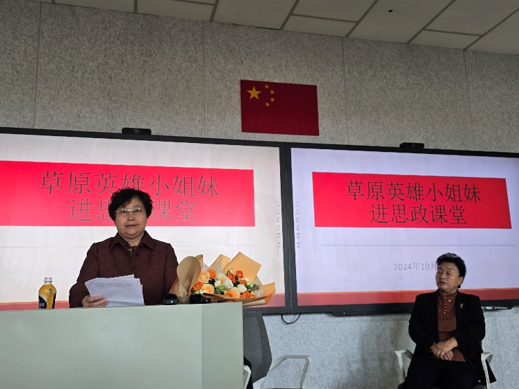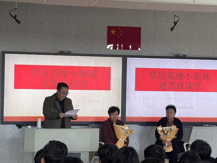 在主旨演讲前,中华民族共同体概论课平平老师组织学生们观看了《草原英雄小姐妹》(动画片),对草原英雄小姐妹的故事有了初步了解。当龙梅和玉荣同志出现在课堂时,同学们惊讶惊喜,思政课堂瞬间充满了六十年间党和国家发展与中华民族精神凝聚的主题氛围。