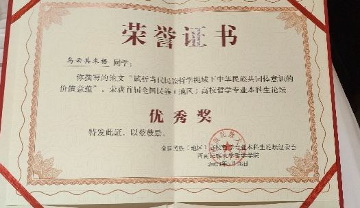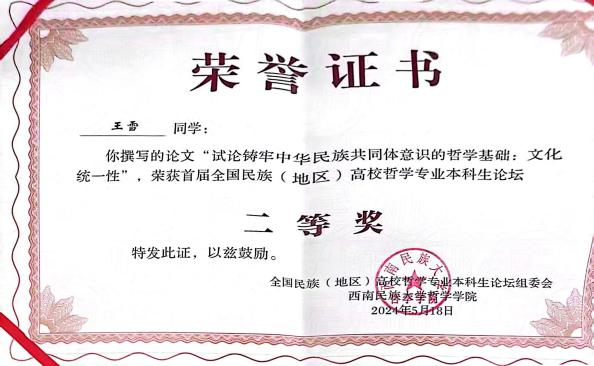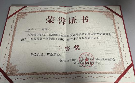beat365哲学系本科生王小丫的论文“试论概念框架在塑造民族共同体认知中的应用价值”、王雪荣的论文“试论铸牢中华民族共同体意识的哲学基础:文化统一性”荣获二等奖,乌云其木格的论文“试析当代民族哲学视域下中华民族共同体意识的价值意蕴”荣获优秀奖。