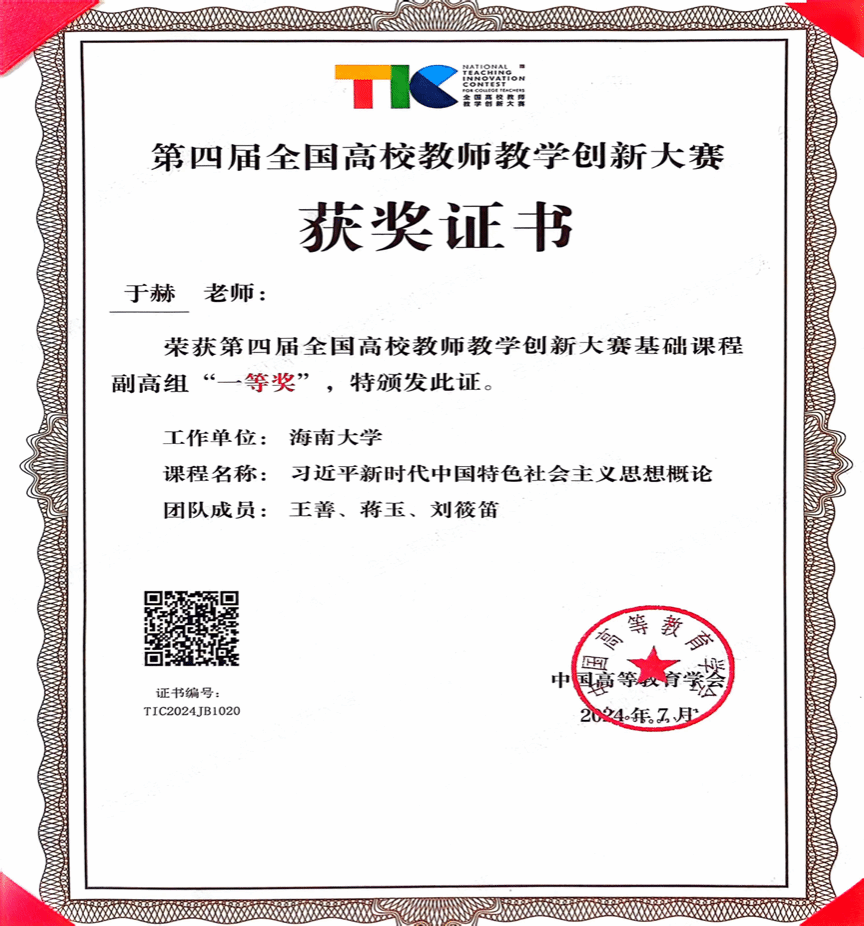澳门正规于赫老师代表海南省与来自全国多所高校的教师进行了同场竞技,主讲了《习近平新时代中国特色社会主义思想概论》,凭借扎实的教学基本功和良好的综合素养,在竞争中脱颖而出,荣获基础课程副高组一等奖,取得了我校也是海南省在全国高校教师教学创新大赛中的历史性突破,展示了澳门正规思政课教师的专业素养、教学水平和精神风貌。