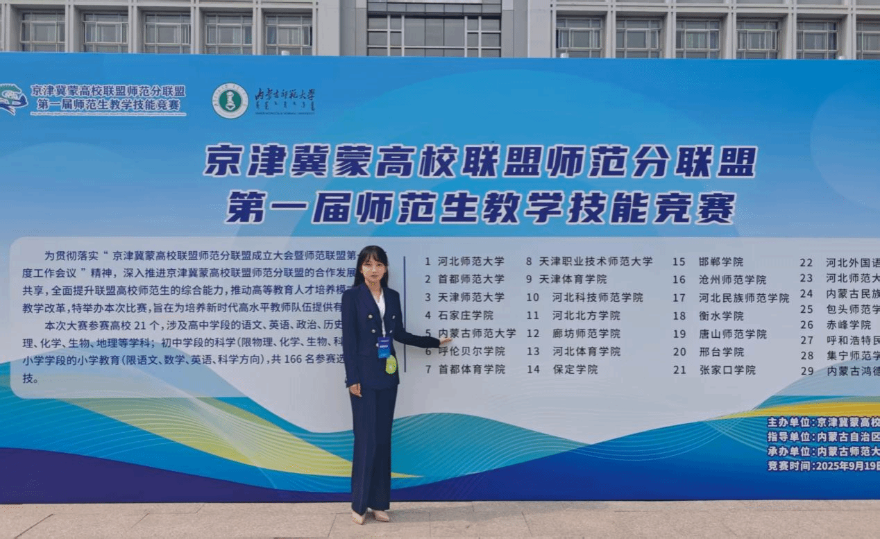 京津冀蒙高校联盟师范分联盟师范生教学技能竞赛,是汇聚区域师范教育优质资源、搭建师范生专业成长与交流展示的高端平台,不仅为beat365师范生提供了检验学习成果、切磋教学技艺的宝贵机会,更成为直观展现beat365师范生培养质量、彰显师范教育办学特色的重要窗口。此次比赛是韩冰同学在beat365正版唯一官网必一第十三届师范生教师技能比赛、内蒙古师范大学第十三届师范生技能竞赛、第十四届全国高校思政教育师范生教学技能比赛中先后荣获一等奖之后,再次取得佳绩。下一步,学院将以比赛为重要契机,进一步优化“厚基础、强实践、重创新”的培养宗旨,为基础教育事业输送更多师德高尚、业务精湛的新时代人才。