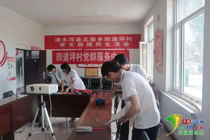 图为队员们正在打扫村委会会议室。中国青年网通讯员韩冰摄
