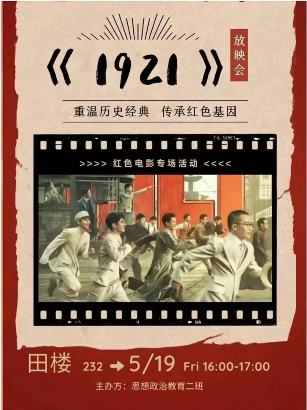 1.为深入贯彻落实二十大精神,赓续传承红色精神和革命精神,本班于2023年5月19日举行"观红色经典,忆峥嵘岁月"观影活动,并在班级公众号发布,得到了学院的大力支持和肯定。本次观影活动组织同学们观看电影《1921》,该片讲述了首批中国共产党人,在风雨如磐的日子中担起了救亡图存重任,让中国革命前途焕然一新的故事。观看电影后,同学们感慨“六合同风,九州共贯”,体悟到了“人不率则不从,身不先则不信”,认识到“欣逢盛世,当不负盛世”。本次观影活动圆满结束,但同学们对于坚定红色信仰、赓续红色血脉、凝聚红色力量的传承精神却如星火,生生不息。