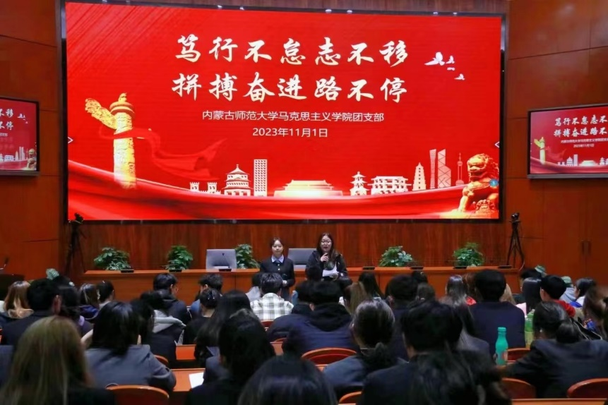 3.2023年11月1日,为深入贯彻二十大精神,深刻领悟习近平新时代中国特色社会主义思想,深入学习“两个确立”的决定性意义,增强“四个意识”、坚定“四个自信”、做到“两个维护”,beat365正版唯一官网必一2022级思想政治教育二班团支部于信息楼报告厅开展“笃行不怠志不移,拼搏奋进路不停”主题团日示范活动。征途漫漫,惟有奋斗,党旗所指,青春所向,党旗飘扬,青春献礼。本次团日活动示范课主要以知识问答形式展开,共唱国歌,以此增强团员和青少年的爱国情怀和民族自豪感,厚植报效祖国、献身人民的情怀,大力弘扬爱国主义精神,引导团员青年自觉将个人梦想与国家前途命运和伟大复兴的中国梦紧密结合起来。此次团日活动让团员加强了认识,大大提高了团员自身的思想政治水平和能力,并使同学们真切意识到要坚持党的领导,坚持爱国主义,坚定理想信念,勇于担当使命,不负时代的要求、人民的期待!